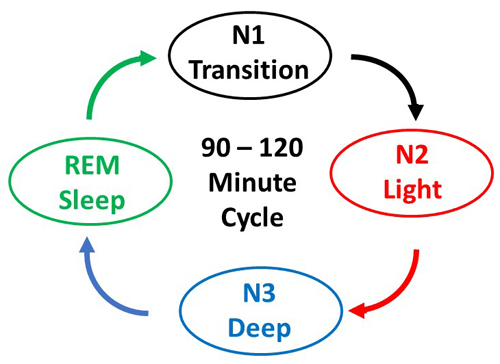 The 4 stages of sleep are N1, N2, N3, and REM. The true purpose of the first 2 stages is to get you to the second 2 stages because all of the good stuff happens in the last 2 stages of your sleep cycle. The first sleep cycle is about 90 – 120 minutes in length. You may have 4-6 cycles per night with each cycle getting shorter.